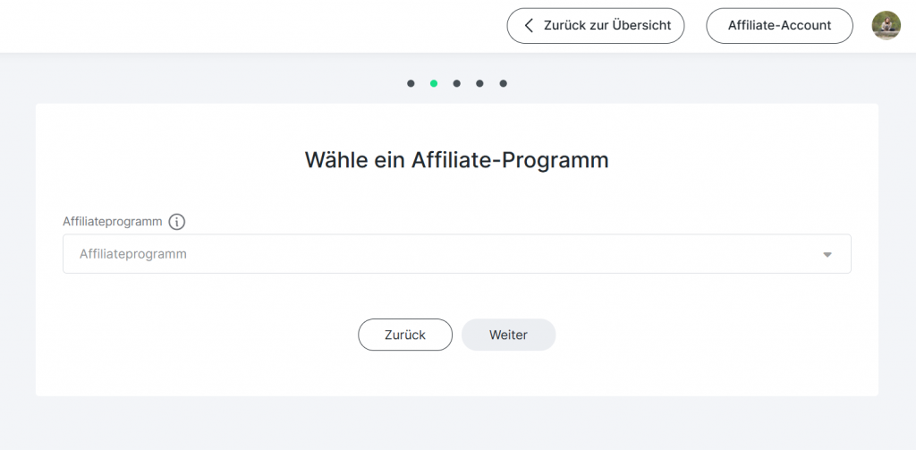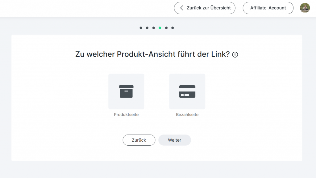 Jetzt werden alle meine Produkte aufgeführt, die mit meinem Programm verknüpft sind. Wähle ein Produkt aus und klicke dann auf WEITER. Danach landest du hier: